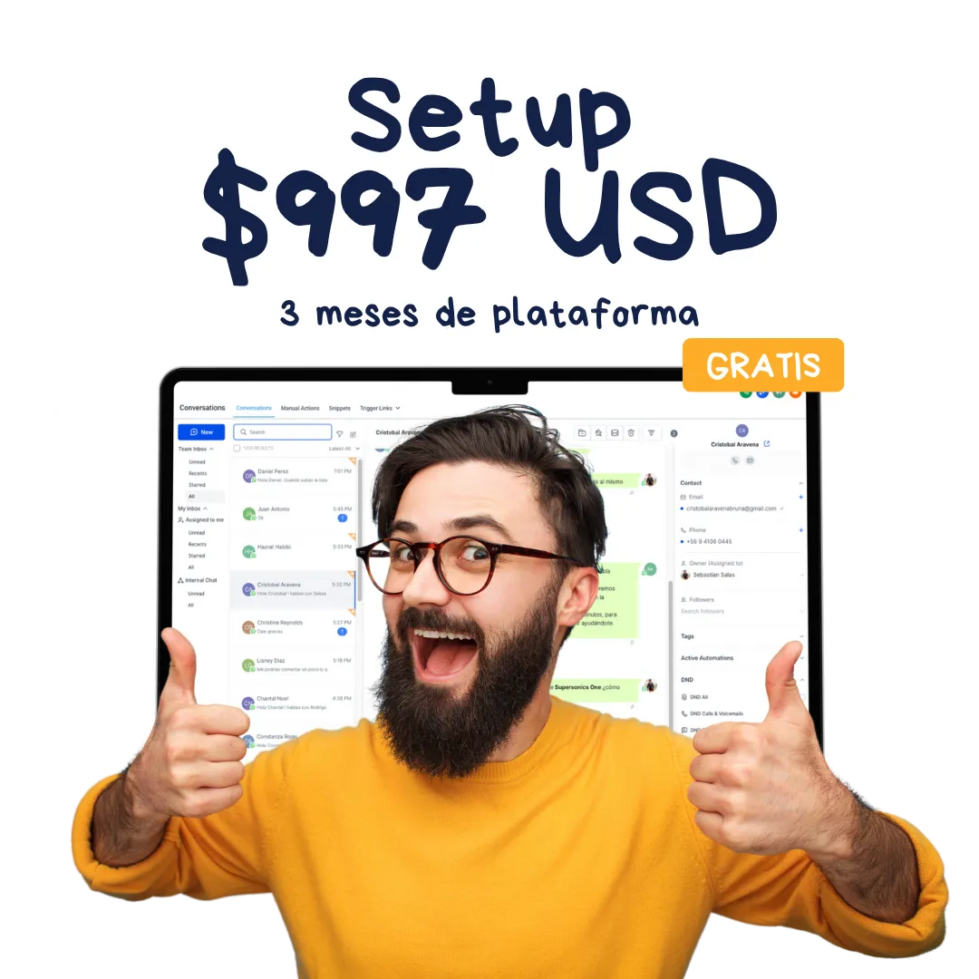 Supersonics ONE incluye CRM, automatización de ventas y marketing, reportes en tiempo real, email marketing, creación de sitios web, WhatsApp API, agendas, planificador de redes sociales, gestión de reputación y mucho más... Todo con soporte en español.